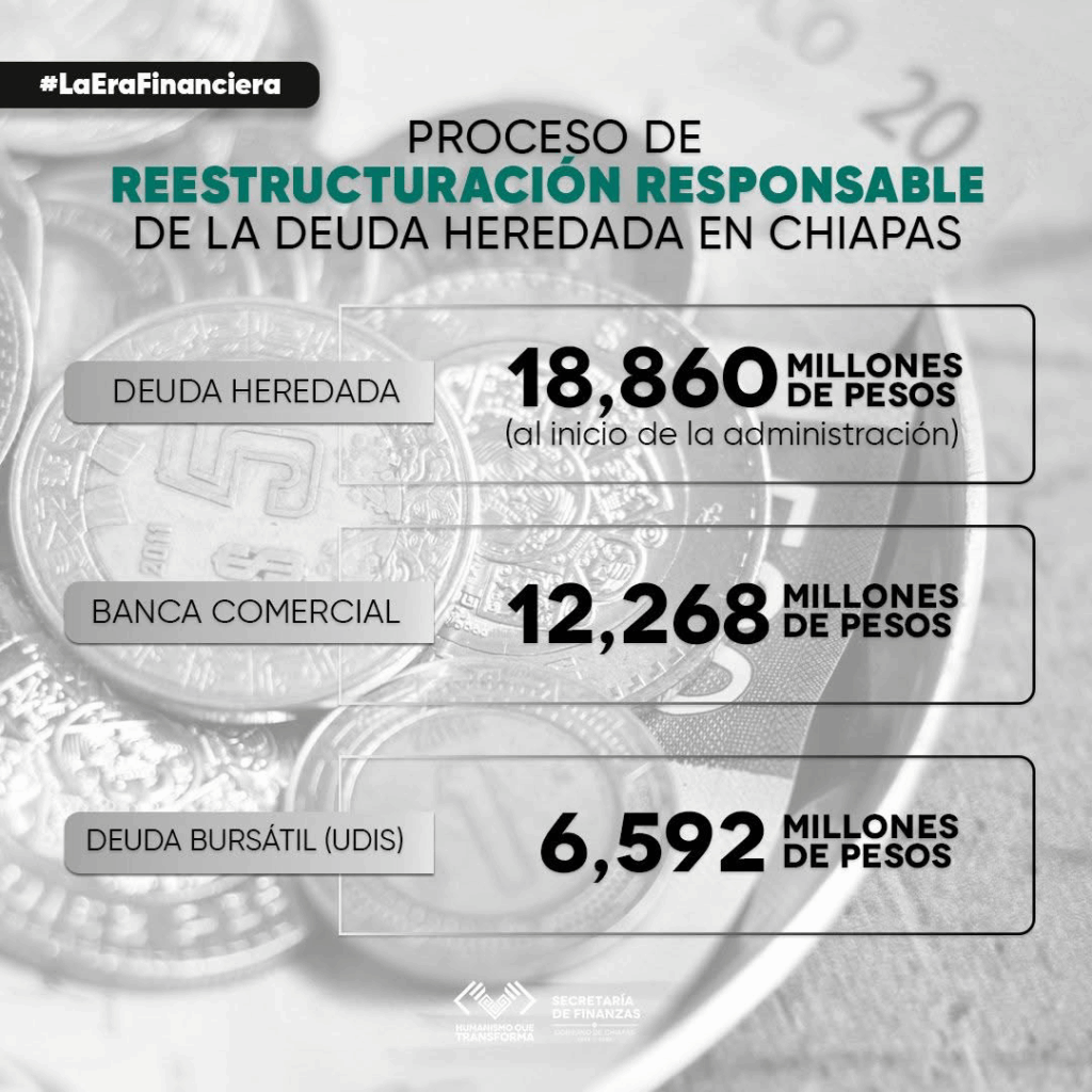 Al inicio de esta administración, Chiapas recibió una deuda total de 18 mil 860 millones de pesos: 12 mil 268 millones con la banca comercial y 6 mil 592 millones en deuda bursátil colocada en condiciones desfavorables desde años anteriores.